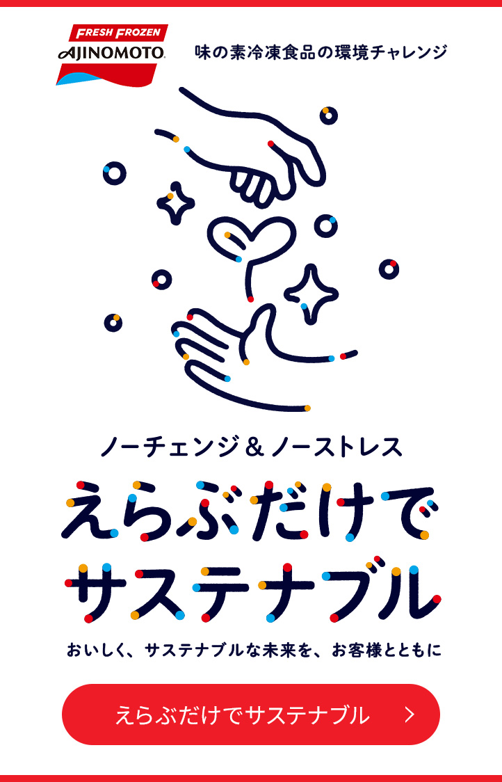 2024年4月3日 【ご注意ください】味の素グループを騙った SNS での不適切投稿について 商品情報 レシピ キャンペーン 企業情報 商品情報 新商品・リニューアル品 カテゴリから探す ブランド・シリーズから探す 商品情報一覧へ レシピ 毎日の献立やお弁当に活用できる冷凍食品を活用したレシピをご紹介 今週のおすすめ 【料理研究家リュウジさんコラボ】「XO醤香る肉焼売」焼きシュウマイ 和風ハンバーグおろしスパ ギョーザ恵方巻 今週のおすすめ 【料理研究家リュウジさんコラボ】「XO醤香る肉焼売」焼きシュウマイ 和風ハンバーグおろしスパ ギョーザ恵方巻 レシピトップへ 知る・楽しむ 動画ギャラリー 工場見学 キャンペーン 安心品質の取り組み 知る・楽しむトップへ 企業情報 企業情報 サステナビリティ 品質保証への取り組み 採用情報 企業情報トップへ 大事なお知らせ 2024.04.03大事なお知らせ 【ご注意ください】味の素グループを騙った SNS での不適切投稿について 2024.03.28大事なお知らせ 紅麹原料使用に関して 2024.02.13大事なお知らせ 【重要なお知らせ】弊社公式Facebook「なりすまし」にご注意ください 大事なお知らせ一覧へ ニュース 2026.02.19プレスリリース 独自技術で“高たんぱく×ジューシー”を実現「たんぱく鶏もも唐揚げ」新発売2026年2月19日(木)より楽天市場で販売開始 2026.02.18お知らせ 「生成AIが当たり前」の職場へ自社IT部門主導で利用率80%超を達成!社内教育とベンダーとの共創で全社・全部署利用を実現 2026.02.17プレスリリース 「環境への配慮」の取り組み進化を目指すスローガンを策定 「ノーチェンジ&ノーストレス えらぶだけでサステナブル」~生活者は負担なく、選ぶだけで環境貢献に!~ ニュース一覧へ 業務用商品 栄養士の方へ