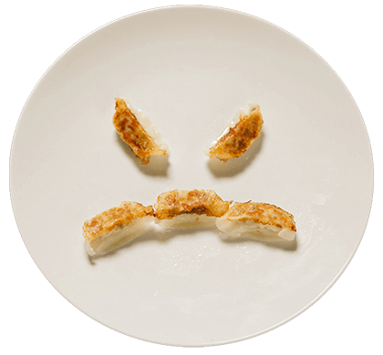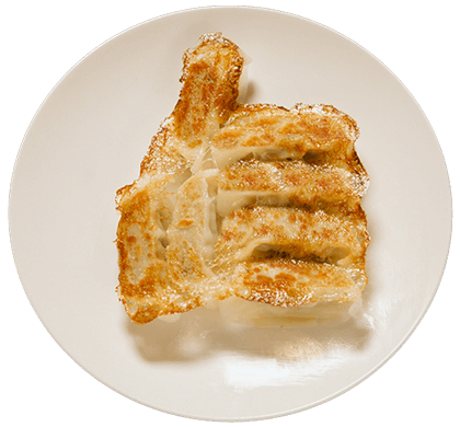 中央に2つのギョーザが埋まる型。フライパンにギョーザがギュウギュウに詰まる様子は、その中に埋もれてみたいと思わせる魅惑に満ちている。