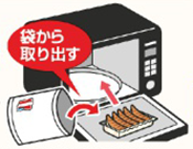 凍ったままの商品を袋から取り出し、ラップをかけずにそのまま電子レンジに入れ、加熱してください。