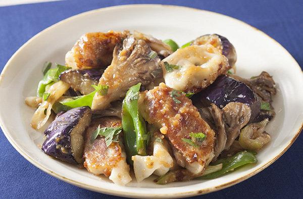 - 3 フライパンをさっとペーパーでふき、サラダ油を入れ、なす、ほぐしたまいたけを炒める。