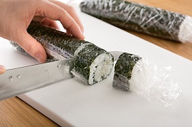 海苔巻きは、ラップを巻いて休ませることでご飯がなじみ、切りやすくなります。切るたびに包丁をぬれ布巾で湿らせ、前後に引きながら、押し付けないように切りましょう。