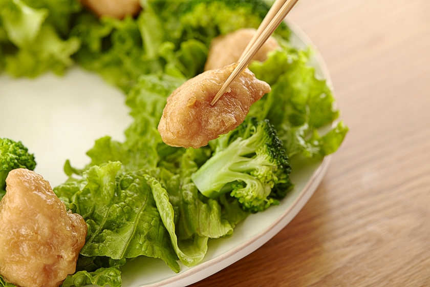 材料を小さく切ってリース状に盛りつけるだけで、クリスマス向けの豪華なサラダメニューに!ヨーグルトドレッシングとから揚げがベストマッチ♪