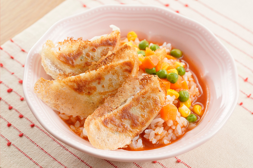 パリッと焼いたギョーザとご飯にケチャップ味のスープを注いだ洋風お茶漬け♪お子さまのランチにも喜ばれそう!辛いホットソースをかければ辛党本格派の大人にもオススメ♪