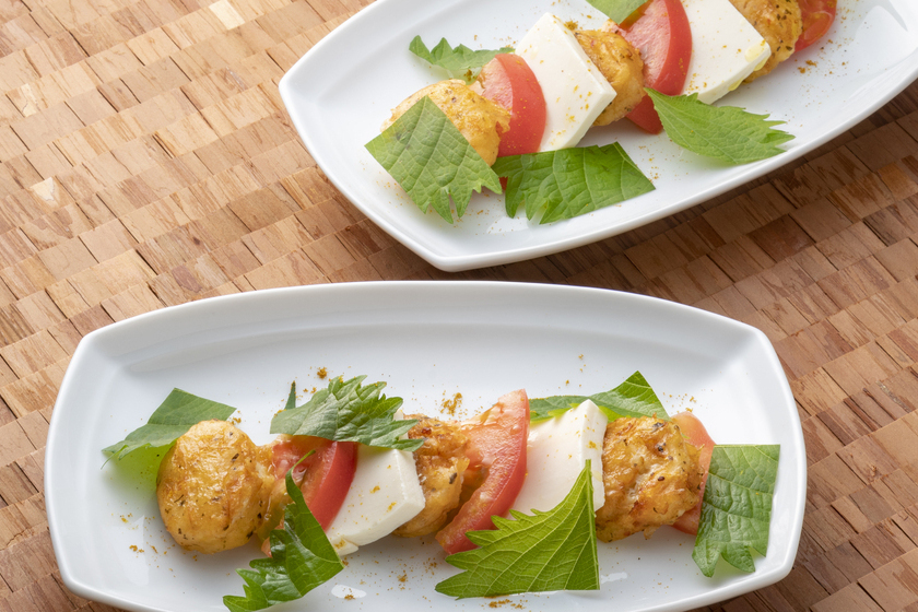 - 4 器に1のチキン、2の豆腐、3のしそ、トマトの順に並べ、食べる前にオリーブオイル、カレー粉をかける。
