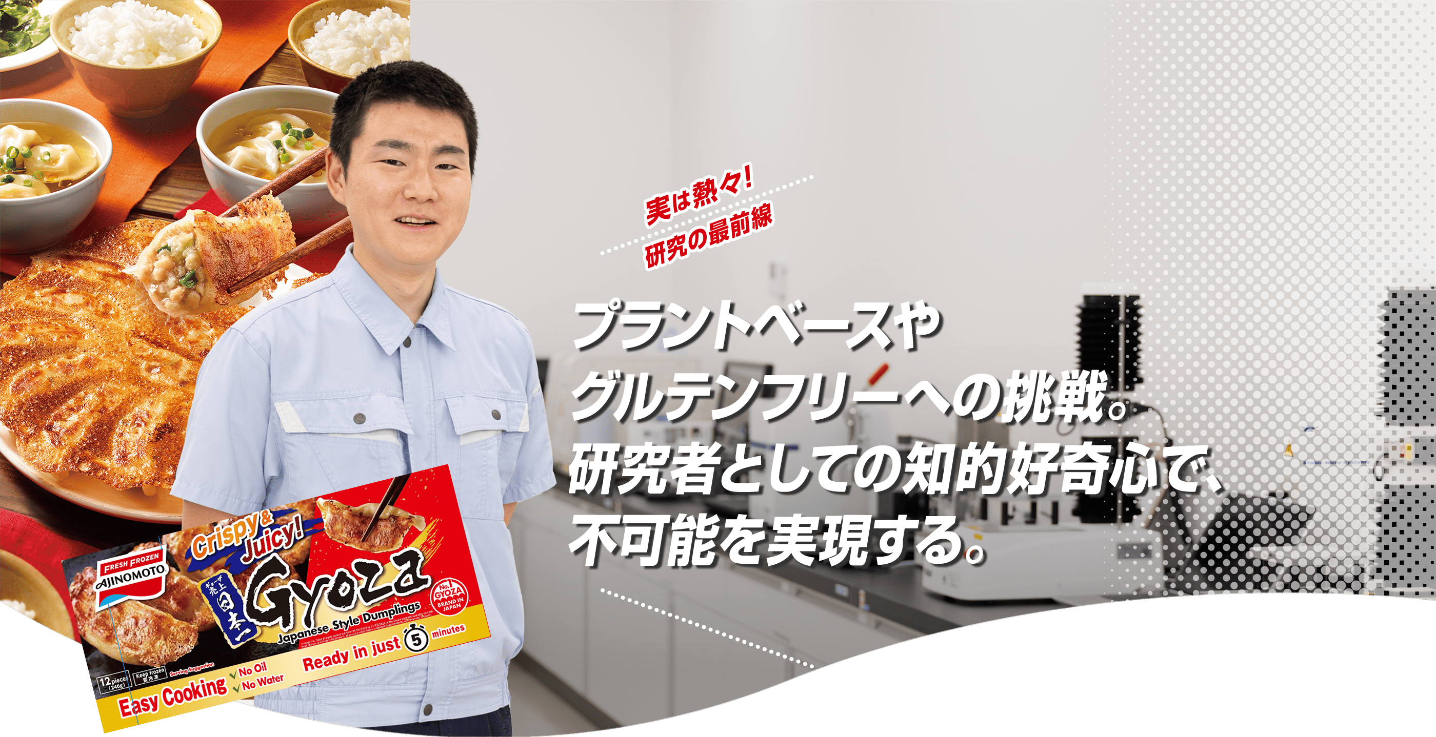 私は技術開発部の基盤技術グループで、動物性原料を植物性素材に代替したプラントベースの餃子や、小麦不使用の餃子の皮の開発など、文化や信条、健康面など様々な背景を持つ方々が同じ食事を楽しめる「食のバリアフリー化」に取り組んでいます。また、フライパンに張り付きにくい餃子の羽根の素の設計など、お客様にとってさらに便利な餃子を実現する技術も検討しています。現在、私は研究職として勤務していますが、味の素冷凍食品での研究と大学時代の研究との違いは、多くの人と関わりながら業務を進める点にあります。業務を進める上で、社会的・経済的に必要な技術の「理」を説くだけでなく、一緒に仕事をする人の気持ちを尊重しながら、困っている人を助け、自分が苦手なことは誰かにサポートを求めるなど、良好な人間関係を保つ上で、「情」の要素も不可欠だと感じています。