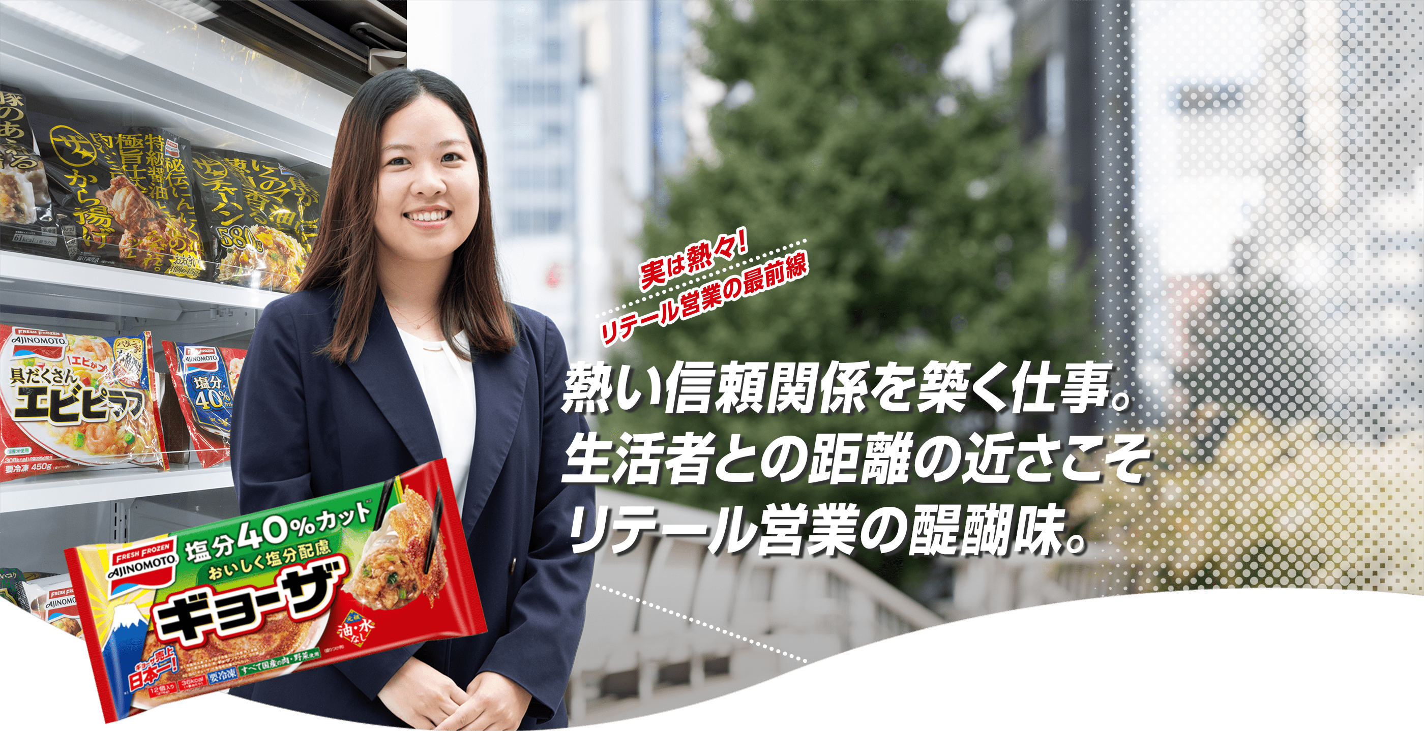 これからも営業としてキャリアを歩み、誰からも頼られる存在でありたいと考えています。私は、生活者の方々が商品を手にするところを目にできる営業という仕事は本当に楽しいと思います。商品開発の楽しさもありますが、それもやはり商品が売れるところが見えるという営業の手応えがあってこそです。また、ドラッグストアグループは新設の部署であり、営業と商品開発を一体で行う組織の新しいあり方も確立させたいと考えています。もう一つ、私個人の目標としては、営業職として海外に赴任し、当社のギョーザの魅力を世界に発信したいというビジョンもあります。近年では営業から海外部門に異動した社員もおり、海外で営業として働くチャンスはあると思っています。ギョーザは当社の看板商品ですし、海外の方にギョーザを焼く体験をしてもらうと、きれいにギョーザの羽ができることに感動してもらえます。ギョーザの可能性は世界に向けてまだまだ広がっていくと信じています!