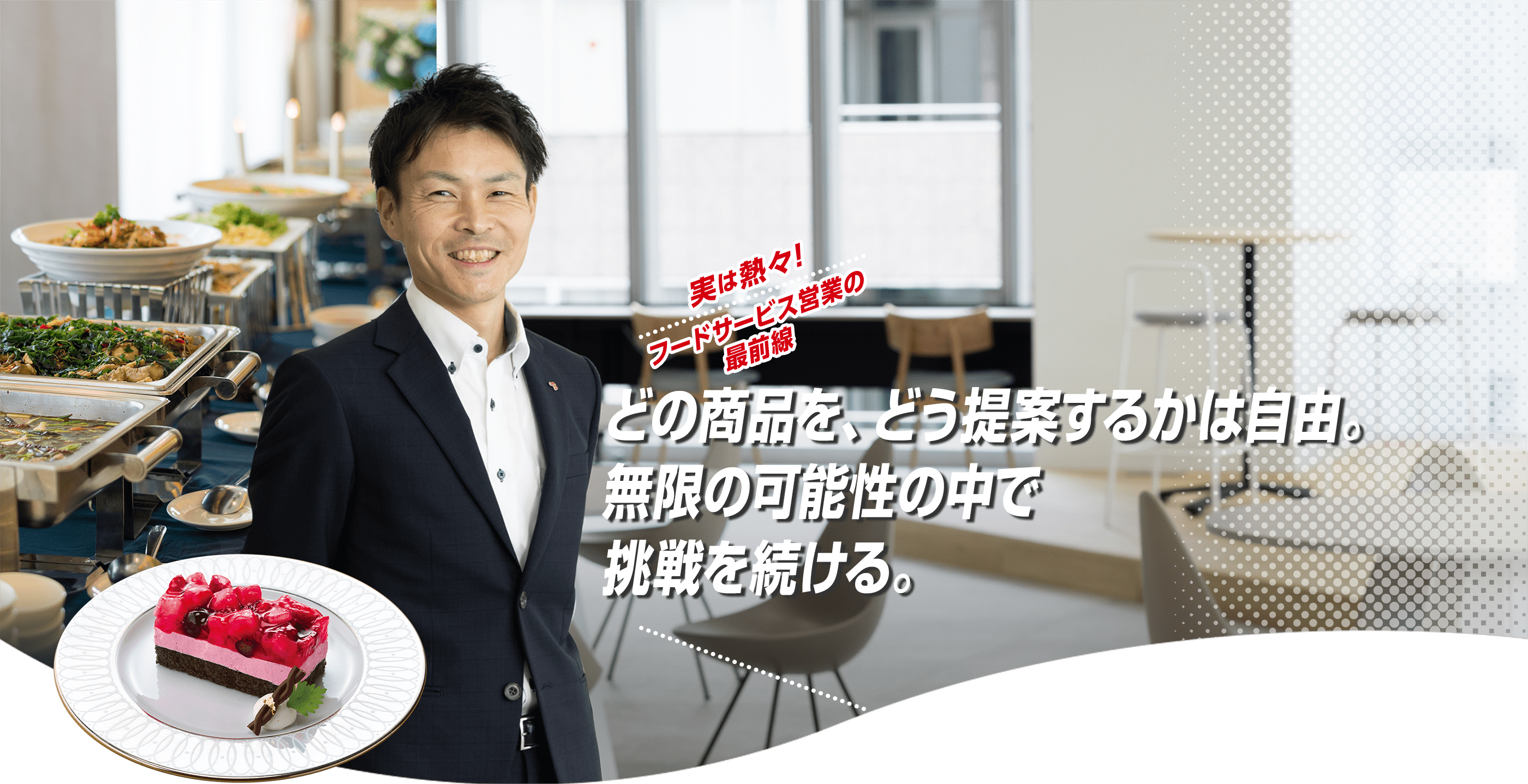 北関東エリアのフードサービス市場(外食産業)で営業を行う部署の組織運営を担っています。フードサービス市場というのは小売店の冷凍食品売り場以外のすべての市場を指しており、ホテルやレジャー施設、居酒屋や病院など食事を提供されている幅広い得意先様が対象となります。得意先様の課題を素早くキャッチアップし、課題解決につながるご提案を直接訪問や卸店経由でご提案するなど、1軒でも多くのお客様の課題を解決できるよう活動しています。世の中が早いスピードで変化していく中、得意先様のニーズに応えるためには、常に挑戦を続け、前進していくことが重要だと考えています。