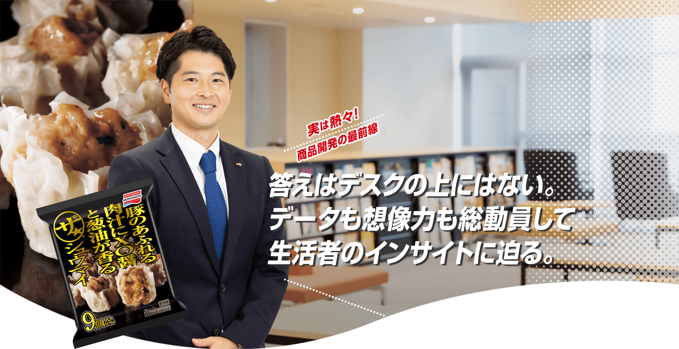 今、世の中ではどんな商品が求められているのか、生活者にはどんな悩みがあるのか、何が世の中のためになるのかを考え続けています。私たちは様々なデータの分析や調査を行った上で市場動向を確認し、商品開発やプロモーションに反映しようと考えますが、調査で得られた結果と実態とでギャップが生じることも多々あります。一例として、調査を行った上で発売したシューマイの新商品がありましたが、実はあまり市場規模が大きくなく、想定よりも売れなかったという事例もありました。